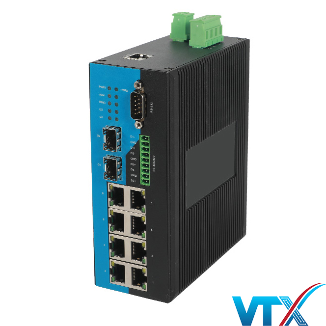 - Hỗ trợ 8 cổng 10 / 100M Ethernet + 2 cổng Gigabit SFP + 1 cổng RS232 + 3 cổng RS485;