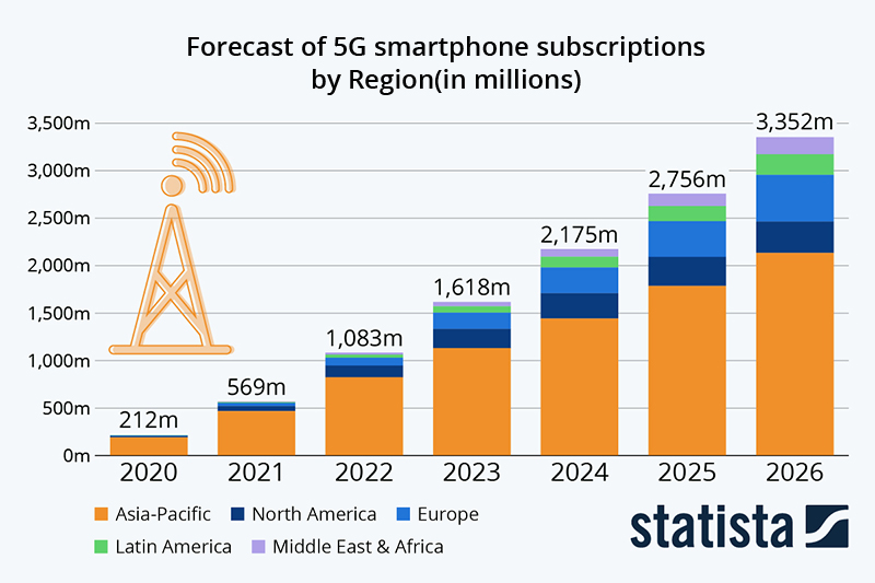Theo báo cáo của Statista , việc áp dụng 5G sẽ đạt 1 tỷ vào năm 2022 và tăng dần hàng năm. Các trường hợp sử dụng 5G, chẳng hạn như video, IoT và AI đang thúc đẩy dữ liệu phát triển đáng kể. Tính toán và lưu trữ dữ liệu dự kiến ​​sẽ phát triển theo cấp số nhân, và số lượng cơ sở hạ tầng máy tính – máy chủ mạng cũng vậy. Máy chủ mạng sẽ tăng bao nhiêu tùy thuộc vào lượng dữ liệu được tạo ra bởi các ứng dụng 5G. Càng nhiều dữ liệu được tạo ra, thì càng cần nhiều máy chủ mạng hơn.