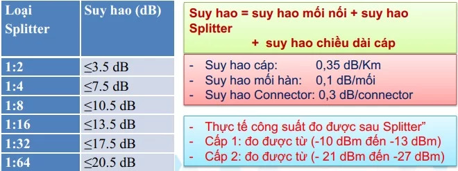 - Suy hao toàn tuyến: yêu cầu <28dBm (khuyến cáo nên <25dBm, 3dBm dự phòng công suất suy giảm theo thời gian.