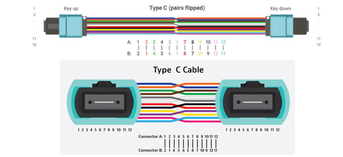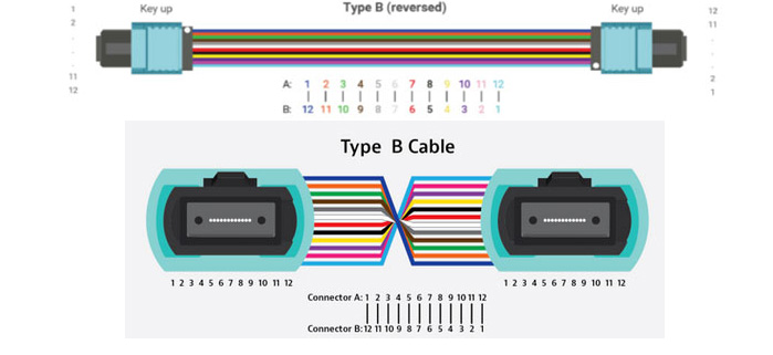 - Cáp Trunk MPO Loại B – Cáp này còn được xác định là cáp đảo. Nó có đầu nối “key up” ở cả hai đầu của cáp. Sắp xếp này dẫn đến một sự đảo ngược, và vị trí sợi quang bị đảo ngược ở mỗi đầu của cáp. Sợi tại P1 sẽ kết nối với P12 ở đầu kia.