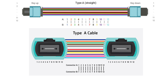 - Cáp Trunk MPO Loại A – Cáp này còn được gọi là cáp thẳng. Đây là cáp thẳng với đầu nối MPO “key up” ở một đầu và đầu nối “key down” ở đầu còn lại. Do đó, các sợi quang ở mỗi đầu có cùng vị trí sợi quang.