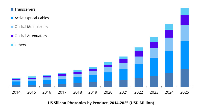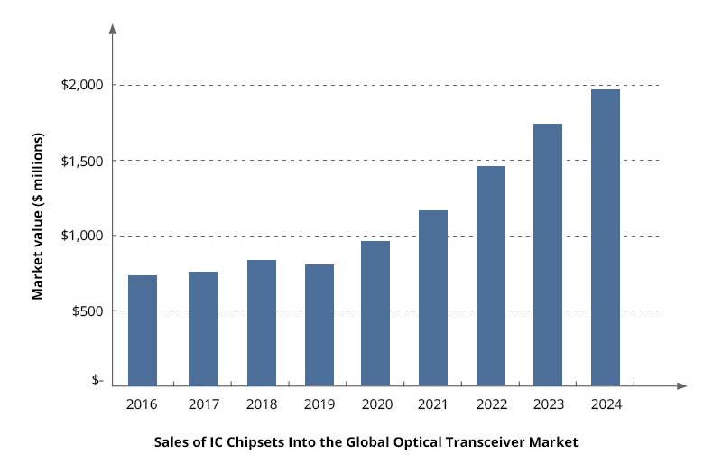 Sau vài năm tăng trưởng trì trệ, thị trường chipset IC được sử dụng trong các máy thu phát quang hiện đang bước vào thời kỳ tăng trưởng cao, với CAGR là 20% trong giai đoạn 2020-2024. Doanh số chipset DSP PAM4 cho các ứng dụng trong bộ thu phát Ethernet và AOC sẽ chiếm một nửa phân khúc thị trường này vào năm 2024. Nhu cầu mạnh mẽ về DSP kết hợp được sử dụng trong các bộ thu phát DWDM cũng sẽ góp phần vào sự tăng trưởng. Việc ra đời của công nghệ 5G cũng thúc đẩy thị trường chip photon silicon, dự kiến sẽ cho thấy sự tăng trưởng vượt bậc trong tương lai. Về giá trị thị trường, các ống dẫn sóng quang, chiếm tổng thị phần 45,4%, chiếm lĩnh thị trường quang tử silicon toàn cầu năm 2015 và dự kiến sẽ đạt tỷ lệ đáng kể vào cuối năm 2022, với CAGR là 21,69%. Xét về phân khúc sản phẩm, thị trường thiết bị thu phát quang chiếm thị phần cao nhất trong năm 2015 và tiếp tục đứng đầu. Khi mà giá của công nghệ quang tử silicon đang cho thấy sự sụt giảm liên tục, thì hiện giờ nhu cầu của sản phẩm đã tăng lên rất nhiều. Trong những năm qua, các công ty như Intel, Cisco, IBM và Juniper Networks đang thể hiện sự quan tâm và đầu tư rộng rãi vào thị trường chip photon silicon để ứng biến các sản phẩm của họ cũng như để chiếm thị phần lớn. Intel đã giới thiệu bộ thu phát quang silicon 100G đầu tiên vào năm 2016 và đã giới thiệu bộ thu phát photon silicon 400G đầu tiên vào cuối năm 2019.